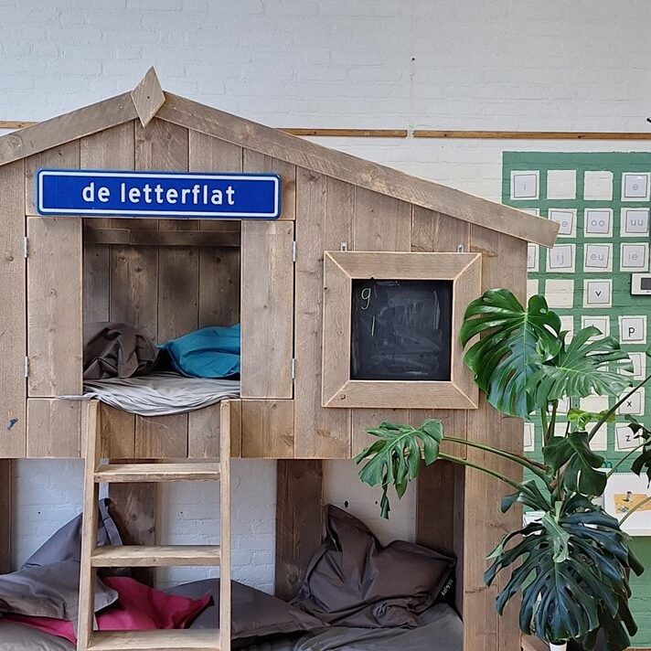 De letterflat is eigenlijk een knusse hoek waar het aanbod van letters/verhalen wordt gecombineerd met taalspelletjes. Het boek van de week staat hier gepresenteerd samen met tal van andere boeken waar kinderen naar hartenlust in kunnen lezen. Daarnaast zijn er altijd taalspelletjes op verschillende niveaus te vinden waar kinderen mee aan de slag kunnen. De letterflat wordt ook vaak ingezet wanneer kinderen tekst willen toevoegen aan hun spel. Is er bijvoorbeeld in de strandtent (zie hierboven) een moestuin gerealiseerd, dan stempelen de kleuters in de letterflat bordjes met daarop de groentesoort. Zo houden de verschillende hoeken steeds verband met elkaar.